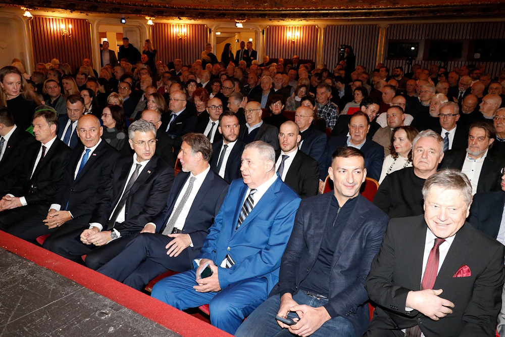 • Hrvatski premijer Andrej Plenković, predsjednik Hrvatskog sabora Gordan Jandroković, članovi Vlade Republike Hrvatske i drugi visoki uzvanici iz Slovenije i Hrvatske nazočili su predstavljanju monografije Prikrivena grobišta Hrvata u Sloveniji u srijedu, 11. veljače 2026., u Hrvatskome narodnom kazalištu u Zagrebu