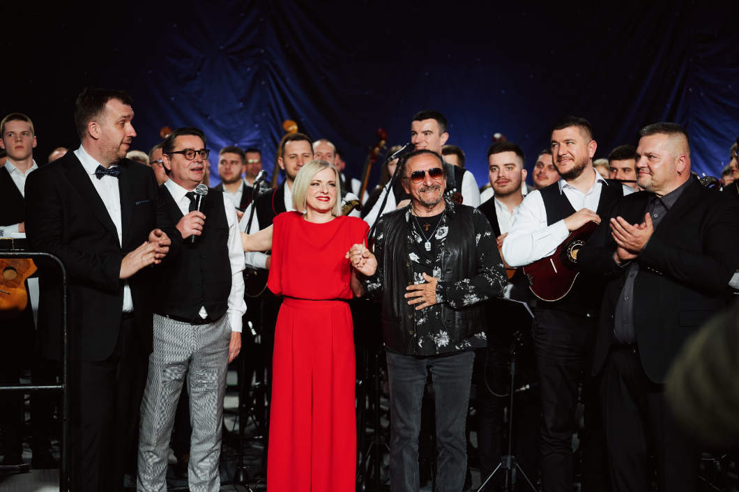 Slijedio je vokalno-instrumentalni blok u kojem je uz tamburaški orkestar nastupio Neno Belan, uz pratnju dviju vokalnih solistica. Kako je voditelj i najavio, riječ je o izvođaču čiji repertoar publika iznimno dobro poznaje, što se potvrdilo već od prvih taktova. Program je otvoren obradom pjesme Ponoćna zvona. Početak, oslonjen na suzdržanu dionicu solo bugarije i vokala, djelovao je pomalo skromno za prostor velike koncertne dvorane, no ostatak izvedbe postupno je razvio puniji zvuk i energiju, jasno pokazujući zašto Belanov opus već desetljećima ostaje prisutan među publikom. U pjevanje se spontano uključila i publika, dodatno pojačavajući doživljaj. Uslijedila je Ružo crvena, izvorno iz repertoara tamburaškog sastava Agrameri, čiji se „dalmatinski“ ugođaj prirodno uklopio u Belanov vokalni izraz i stilsku prepoznatljivost. Orkestar je pritom održao stabilnu i funkcionalnu pratnju, bez narušavanja vokalne linije. Treća pjesma, Ivona, koju je Belan najavio kao svojevrsni „hrvatski reggae na tamburama“, donijela je posebno zanimljiv aranžerski pristup. Obrada se pokazala iznimno uspješnom, čak i dojmljivijom od izvornika u kontekstu tamburaškog zvuka, potvrđujući da se promišljenim tretmanom instrumentarija tambura može uvjerljivo uklopiti u različite žanrovske okvire. Publika je s velikim entuzijazmom sudjelovala u izvedbi, pjevajući refren unatoč vremenskom odmaku od nastanka pjesme. Iako je Belan napomenuo da dosad nije nastupao s tamburaškim orkestrom, ova je suradnja jasno pokazala značajan izvedbeni i repertoarni potencijal.