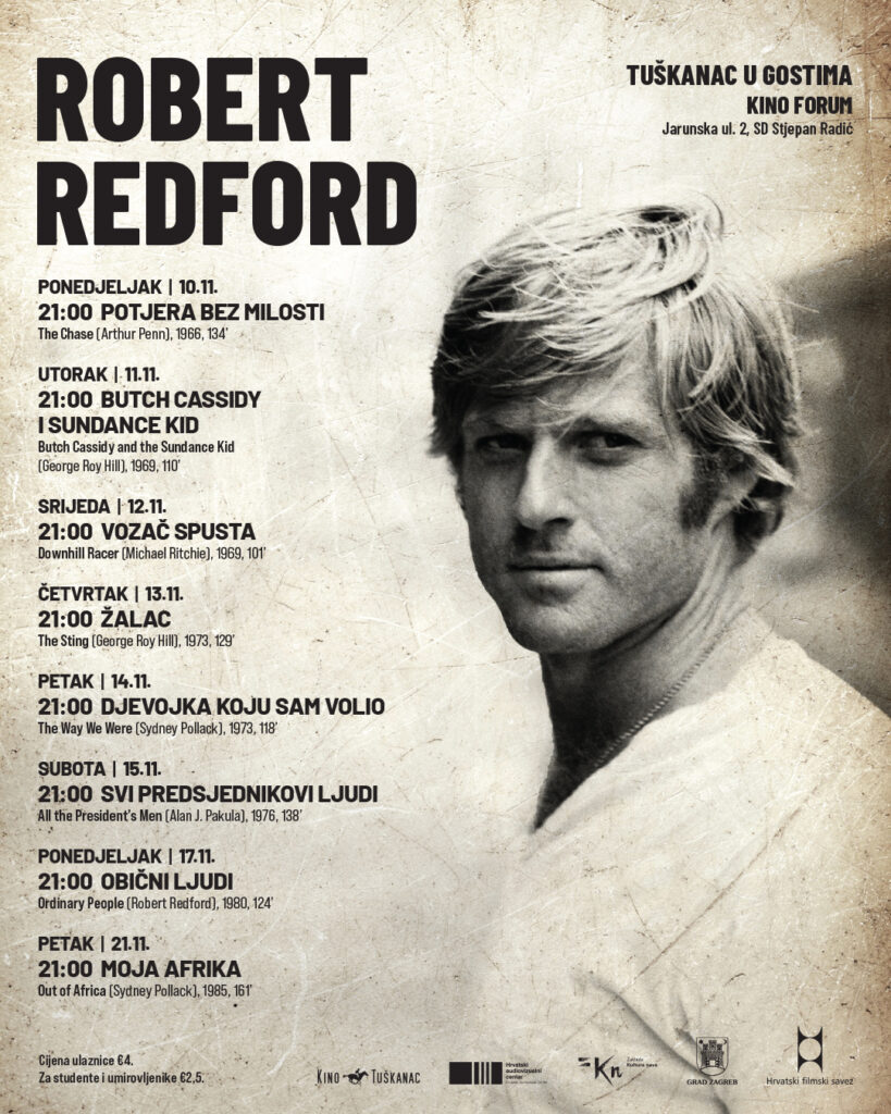 U spomen na nedavno preminulog Roberta Redforda, Tuškanac u gostima sredinom studenog donosi izbor najznačajnijih ostvarenja njegova opusa. Poznat po suptilnom izrazu i intelektualnom šarmu, slavu je stekao kao glumac u klasicima 1960-ih i 1970-ih poput Butch Cassidy i Sundance Kid te Žalac, a potom i redateljskim opusom koji odlikuje humanistički pristup te jednostavan, ali dojmljiv prikaz društvenih tema. Osim autorskog doprinosa, Redford će ostati zapamćen i kao ključna figura američkog nezavisnog filma, čiji je prijelomni trenutak bilo osnivanje Sundance Instituta te uspostavljanje institucionalne platforme za američki nezavisni film i autore izvan studijskog sustava.